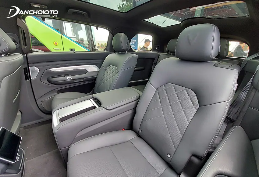 Mang ưu thế kích thước “khủng”, không gian hàng ghế thứ hai trên VF9 rất rộng rãi. Khoảng cách trần cực kỳ thoáng. Hàng ghế thứ hai có cả chức năng sưởi.