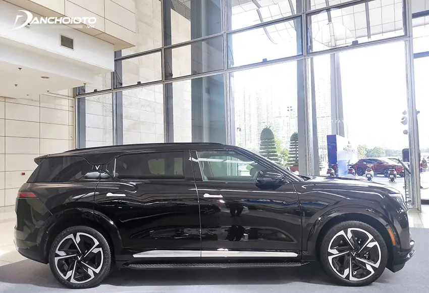 Với chiều dài cơ sở lên đến 3.150 mm, thân xe VinFast VF9 2023 sở hữu dáng vẻ bề thế, chuẩn SUV full-size. Kết hợp thêm những đường dập gân guốc nhấn nhá càng tăng thêm vẻ sang trọng và cao cấp cho mẫu 7 chỗ này. Nhìn từ bên hông, có một điểm độc đáo là trụ C chẻ đôi, đính logo thương hiệu, rất lạ mắt.
