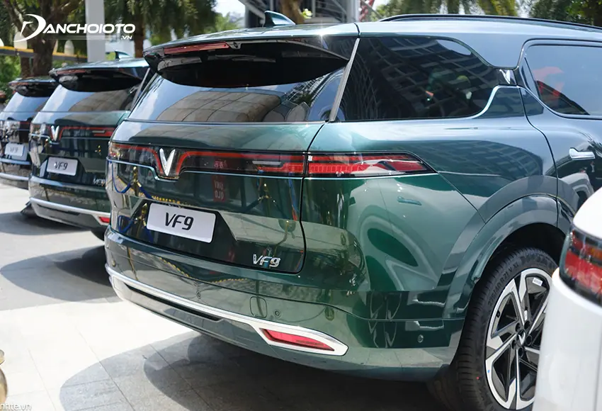 Phần cản sau bệ vệ với bộ đôi ống xả lớn kết nối với nhau qua phần ốp viền mạ bạc đẹp mắt. Bên cạnh đó, đuôi xe còn được trang bị ăng ten vây cá, cánh hướng gió, đèn phanh trên cao. Ngoài ra, VF9 cũng có tấm bảo vệ dưới thân xe.
